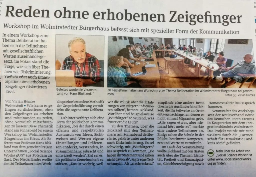 On invitation of Deutsches Rotes Kreuz (Kreisverband Börde) and Integrationsbündnis Wolmirstedt we had a great workshop on Saturday, July 6, in Wolmirstedt (Sachsen-Anhalt). The workshop (10 AM – 5 PM) was made possible by the program Demokratie Leben! of the Bundesministerium für Familie, Senioren, Frauen und Jugend. We discussed democracy (the need of citizens to discuss together the values that bind and the need to deliberate together the main themes of elections before casting a vote), identity (what is it, how does it develop, can it change?), discrimination (what is it, why do people discriminate and how, and what to do against it?), gender equality (what explains the vast gender inequality in Germany?) and homosexuality (how do people become gay, why it is not a disease, why couples of the same sex can form a family able to raise children). Philipp did a great job discussing identity and homosexuality. The newspaper of Sachsen-Anhalt, Die Volksstimme, reported about the event: