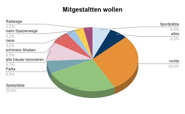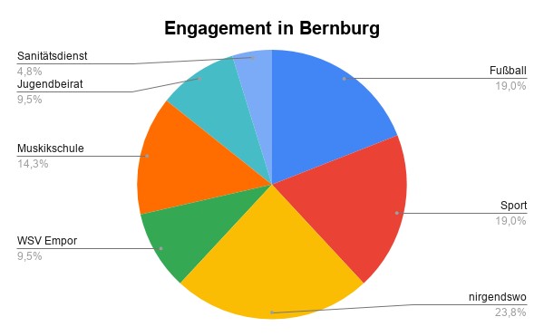 Auf die Frage “Was möchtest du gerne in Bernburg mitgestalten?” antworteten 26% “Spielplätze”, 10% die Renovierung alter Häuser, 7% Parks, 7% Sportstätten, 3% Wanderwege, 3% Fahrradwege, 7% “alles” und 29% “nichts”. Auf die Frage “Wo engagierst du dich in Bernburg?” antworteten 19% Fußball, 19% Sport, 14% Musikschule, 10% der Wassersportverein Empor, 10% der Jugendbeirat und 5% der Sanitätsdienst. 24% nehmen an nichts teil. Nur sehr wenige Menschen scheinen sich in sozialen Organisationen zu engagieren, die sich auf öffentliche Interessen konzentrieren.