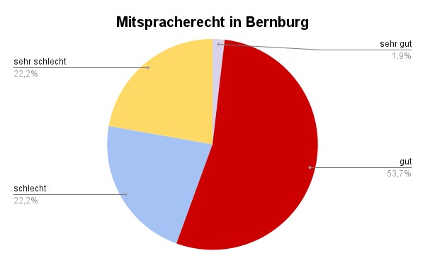 Wie sieht es mit der gesellschaftlichen Teilhabe aus? 74% der Befragten waren der Meinung, dass Bernburg mehr für die Jugend tun sollte. Die Möglichkeit, über die Belange der Stadt Bernburg mitzubestimmen, wurde von 2% der Befragten als “sehr gut” bezeichnet. “Gut” war die Meinung von 54 % der Befragten. 22% hielten die Chance für “schlecht” und 22% für “sehr schlecht”.