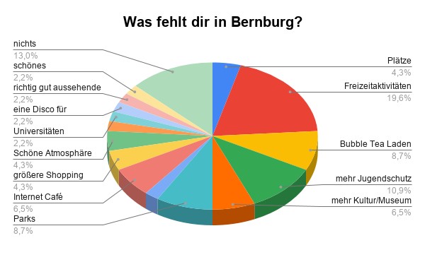 “Was fehlt dir, damit Bernburg attraktiver für dich wird?” war eine anschließende Frage. 20 % der formulierten Antworten bezogen sich auf fehlende Freizeitmöglichkeiten, 11 % auf fehlenden “Jugendschutz”, 9 % auf Parks, 9 % auf fehlende McDonalds in der Innenstadt (3 Personen), ein Kentucky Fried Chicken (2 Personen), ein Subway (2 Personen) oder ein Bubble Tea Shop (1 Person), 7 % der Antworten bezogen sich auf fehlende Kultur und Museen, 7 % auf ein Internetcafé, 4 % auf geringe Einkaufsmöglichkeiten und 4 % auf fehlende Treffpunkte. 13% vermissten gar nichts oder gaben an, dass alles so bleiben sollte, wie es jetzt ist.