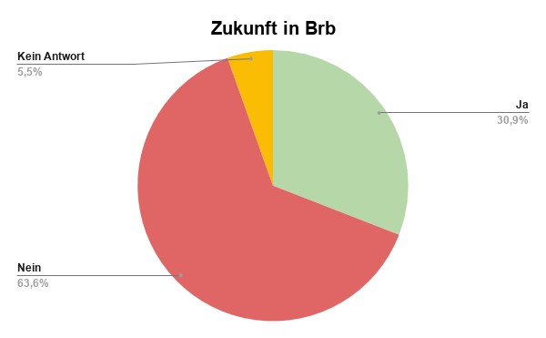 Auf die Frage “Siehst du deine Zukunft in Bernburg?” antworteten 35 Befragte (64%) mit Nein und 17 (31%) mit Ja. Die restlichen 5% wussten es noch nicht.