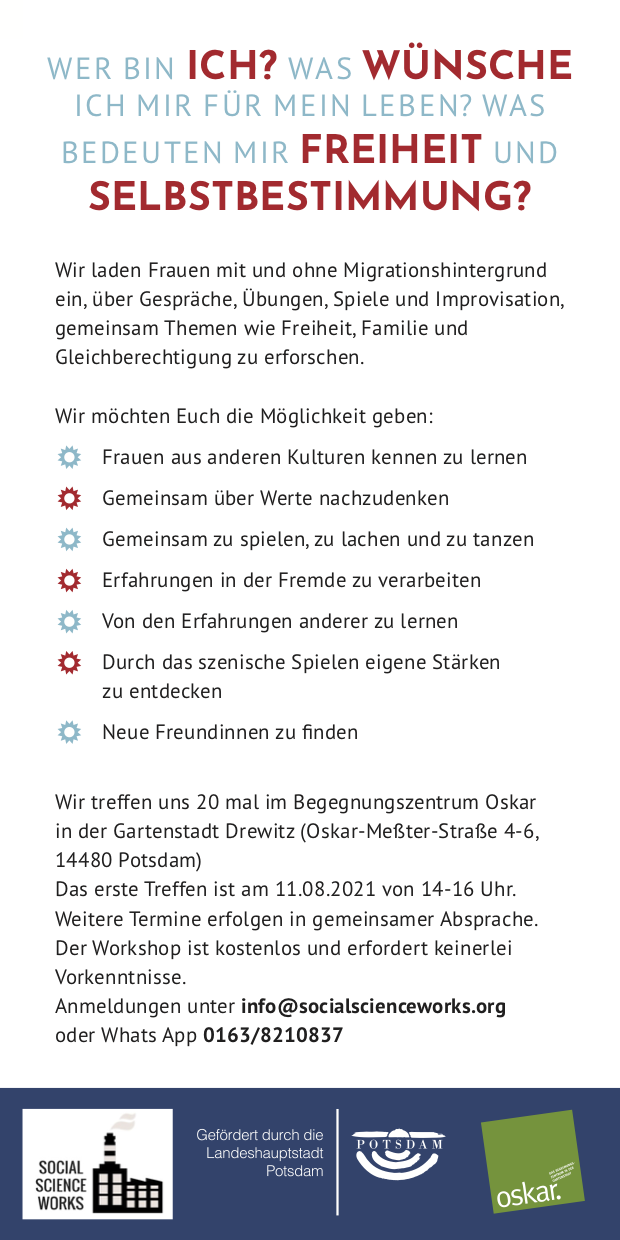 In August we will start a second round of our workshop series Empowerment through Deliberation and Theater at the Oskar community center in Potsdam Drewitz. This time we would like to bring refugee women together with native women.
