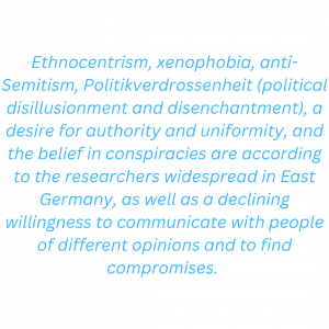 Ethnocentrism, xenophobia, anti-Semitism, Politikverdrossenheit (political disillusionment and disenchantment), a desire for authority and uniformity, and the belief in conspiracies are according to the researchers widespread in East Germany, as well as a declining willingness to communicate with people of different opinions and to find compromises. In their conclusions, they sound the alarm: „There are clear signs that the fragmentation and polarization of society, which has been progressing for two decades, will lead to a further spiral of radicalization in the coming years“ (2023: 26).[21]