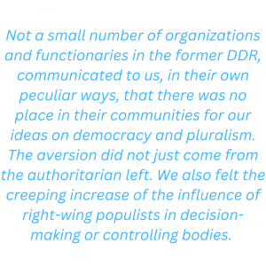 Not a small number of organizations and functionaries in the former DDR, communicated to us, in their own peculiar ways, that there was no place in their communities for our ideas on democracy and pluralism. The aversion did not just come from the authoritarian left. We also felt the creeping increase of the influence of right-wing populists in decision-making or controlling bodies. In this regard, Schroeder et al (2020) showed how representatives of the Alternative für Deutschland and other right-wing organizations increasingly try to, what student leader Rudi Dutschke called in the sixties, “march through the institutions”. In August 2019, the AfD leadership also formally decided to follow this strategy in its internal paper “Strategie 2019-2025. Die AfD auf dem Weg zur Volkspartei” (Strategy 2019-2025. The AfD on the way to becoming a people’s party).[7]