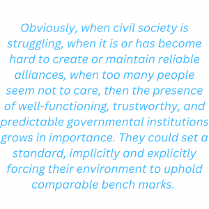 Obviously, when civil society is struggling, when it is or has become hard to create or maintain reliable alliances, when too many people seem not to care, then the presence of well-functioning, trustworthy, and predictable governmental institutions grows in importance. They could set a standard, implicitly and explicitly forcing their environment to uphold comparable bench marks. Unfortunately, certainly in Brandenburg and in the policy spheres where Social Science Works has been active so far, such institutions are not common. It would take a long historical, anthropological and sociological inquiry to ascertain what exactly explains the state of governance in Brandenburg and comparable German federal states. The partly Prussian ancestry, the comparably authoritarian DDR-heritage, the fact that democracy was formally established only three decades ago, the continuous presence of many people in the administration with a specific ‘past’, the tardiness characterizing many rural societies, the widespread feel of decline and decay, and the resulting mood of desperation, ineptitude, inefficacy and lethargy, probably all play a role.