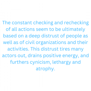 The constant checking and rechecking of all actions seem to be ultimately based on a deep distrust of people as well as of civil organizations and their activities. This distrust tires many actors out, drains positive energy, and furthers cynicism, lethargy and atrophy. It might be bearable, maybe, when the authorities would be reliable partners themselves, respecting their own rules and regulations, and following standards of good governance. Unfortunately, this is not always the case.