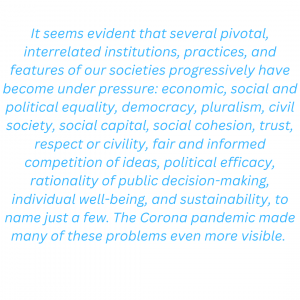 It seems evident that several pivotal, interrelated institutions, practices, and features of our societies progressively have become under pressure: economic, social and political equality, democracy, pluralism, civil society, social capital, social cohesion, trust, respect or civility, fair and informed competition of ideas, political efficacy, rationality of public decision-making, individual well-being, and sustainability, to name just a few. The Corona pandemic made many of these problems even more visible.