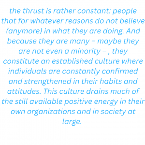 We have plenty of this kind of anecdote. Already out of a kind of anthropological curiosity, we regularly kept a diary of our encounters with functionaries of governmental and civil organizations. It would be tedious to present many more stories of these encounters, because the thrust is rather constant: people that for whatever reasons do not believe (anymore) in what they are doing. And because they are many – maybe they are not even a minority – , they constitute an established culture where individuals are constantly confirmed and strengthened in their habits and attitudes. This culture drains much of the still available positive energy in their own organizations and in society at large. A substantial part of our working time is filled with repeatedly contacting officials, administrators, social workers, educators to remind them, that we had an agreement or appointment. What is striking about these communications is that people are mostly long past shame. Rarely if ever do they apologize for their negligence, unreliability and unpredictability: why should they apologize for a common culture of non-commitment?