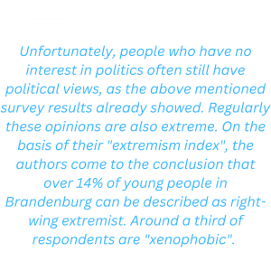Unfortunately, people who have no interest in politics often still have political views, as the above mentioned survey results already showed. Regularly these opinions are also extreme. On the basis of their “extremism index”, the authors come to the conclusion that over 14% of young people in Brandenburg can be described as right-wing extremist. Around a third of respondents are “xenophobic”. Here too, the higher the education, the lower these tendencies are: right-wing extremism is up to four times more prevalent at secondary schools preparing for vocational jobs (24.6%) than at gymnasia or grammar schools (6%), preparing for higher forms of education.