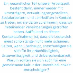 An Anekdoten dieser Art mangelt es uns nicht. Schon aus einer Art anthropologischer Neugier heraus haben wir regelmäßig ein Tagebuch über unsere Begegnungen mit Funktionären staatlicher und ziviler Organisationen geführt. Es wäre mühsam, viele weitere Geschichten dieser Begegnungen zu erzählen, denn die Stoßrichtung ist ziemlich konstant: Menschen, die aus welchen Gründen auch immer nicht (mehr) an das glauben, was sie tun. Und weil es so viele sind – vielleicht sind sie nicht einmal eine Minderheit -, bilden sie eine etablierte Kultur, in der Einzelne ständig in ihren Gewohnheiten und ihrer Moral bestätigt und bestärkt werden. Diese Kultur raubt viel von der noch vorhandenen positiven Energie in ihren eigenen Organisationen und in der Gesellschaft insgesamt. Ein wesentlicher Teil unserer Arbeitszeit besteht darin, immer wieder mit Amtsträgern, Verwaltungsangestellten, Sozialarbeitern und Lehrkräften in Kontakt zu treten, um sie daran zu erinnern, dass wir miteinander Vereinbarungen getroffen haben. Auffallend an diesen Kontaktaufnahmen ist, dass die Leute sich meist schon lange nicht mehr schämen. Selten, wenn überhaupt, entschuldigen sie sich für ihre Nachlässigkeit, Unzuverlässigkeit und Unberechenbarkeit: Warum sollten sie sich auch für eine gemeinsame Kultur der Unverbindlichkeit entschuldigen?