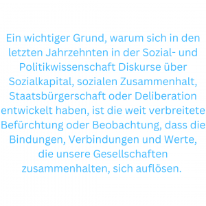 Ein wichtiger Grund, warum sich in den letzten Jahrzehnten in der Sozial- und Politikwissenschaft Diskurse über Sozialkapital, sozialen Zusammenhalt, Staatsbürgerschaft oder Deliberation entwickelt haben, ist die weit verbreitete Befürchtung oder Beobachtung, dass die Bindungen, Verbindungen und Werte, die unsere Gesellschaften zusammenhalten, sich auflösen. Dies erklärt auch, warum es in Deutschland gut finanzierte politische Programme gibt wie “Demokratie Leben!“ oder “Zusammenhalt durch Teilhabe”. Es kann daher nicht überraschen, dass die Rekrutierung von Teilnehmern für deliberative Projekte oder andere Projekte, die Menschen zusammenbringen sollen, die größte Hürde bei der Umsetzung dieser Projekte darstellt. Demokratisierungs- oder Integrationsprojekte in Deutschland scheitern regelmäßig an der mangelnden Teilnehmerzahl. Doch das Ausmaß des Problems und das Ausmaß, in dem die Ursachen auch in die Bereiche der Gesellschaft vorgedrungen sind, in denen wir es uns am wenigsten leisten können, hat uns regelmäßig überrascht.