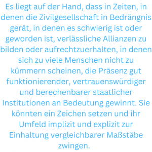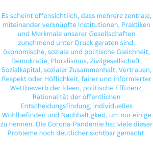 Es scheint offensichtlich, dass mehrere zentrale, miteinander verknüpfte Institutionen, Praktiken und Merkmale unserer Gesellschaften zunehmend unter Druck geraten sind: ökonomische, soziale und politische Gleichheit, Demokratie, Pluralismus, Zivilgesellschaft, Sozialkapital, sozialer Zusammenhalt, Vertrauen, Respekt oder Höflichkeit, fairer und informierter Wettbewerb der Ideen, politische Effizienz, Rationalität der öffentlichen Entscheidungsfindung, individuelles Wohlbefinden und Nachhaltigkeit, um nur einige zu nennen. Die Corona-Pandemie hat viele dieser Probleme noch deutlicher sichtbar gemacht.