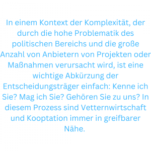 Aktivitäten nach wie ihre akademischen Kollegen: dem Aufbau von Netzwerken oder persönlichen Verbindungen, die die Akquise von finanzieller Unterstützung und die Entscheidung über Fördermittel erleichtern. In einem Kontext der Komplexität, der durch die hohe Problematik des politischen Bereichs und die große Anzahl von Anbietern von Projekten oder Maßnahmen verursacht wird, ist eine wichtige Abkürzung der Entscheidungsträger einfach: Kenne ich Sie? Mag ich Sie? Gehören Sie zu uns? In diesem Prozess sind Vetternwirtschaft und Kooptation immer in greifbarer Nähe. Der Grat zwischen einer offenen, pluralistischen Gesellschaft und einem von Klientelismus und Günstlingswirtschaft beherrschten Kartell ist schmal. Kritik und Veränderung sind auch deshalb schwierig, weil zu viele Menschen vom Status quo profitieren und die Privilegierten Kritik immer als sauer abtun können.