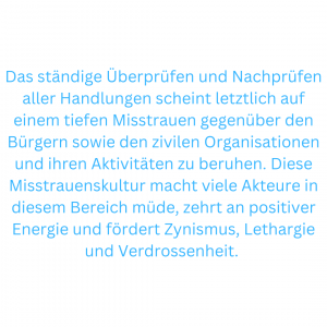 Das ständige Überprüfen und Nachprüfen aller Handlungen scheint letztlich auf einem tiefen Misstrauen gegenüber den Bürgern sowie den zivilen Organisationen und ihren Aktivitäten zu beruhen. Diese Misstrauenskultur macht viele Akteure in diesem Bereich müde, zehrt an positiver Energie und fördert Zynismus, Lethargie und Verdrossenheit. Es wäre vielleicht erträglicher, wenn die Behörden selbst verlässliche Partner wären, die ihre eigenen Regeln und Vorschriften einhalten und sich an die Standards der guten Regierungsführung oder „Good Governance“ halten würden. Leider ist dies nicht immer der Fall.