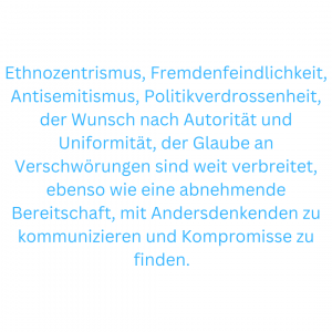 Kurz gesagt, Ethnozentrismus, Fremdenfeindlichkeit, Antisemitismus, Politikverdrossenheit, der Wunsch nach Autorität und Uniformität, der Glaube an Verschwörungen sind weit verbreitet, ebenso wie eine abnehmende Bereitschaft, mit Andersdenkenden zu kommunizieren und Kompromisse zu finden. In ihren Schlussfolgerungen schlagen die Forscher Alarm: „Es gibt deutliche Anzeichen dafür, dass die seit zwei Dekaden voranschreitende Fragmentierung und Polarisierung der Gesellschaft in den nächsten Jahren in einer weitergehenden Radikalisierungsspirale mundet“ (2023: 26).[16]