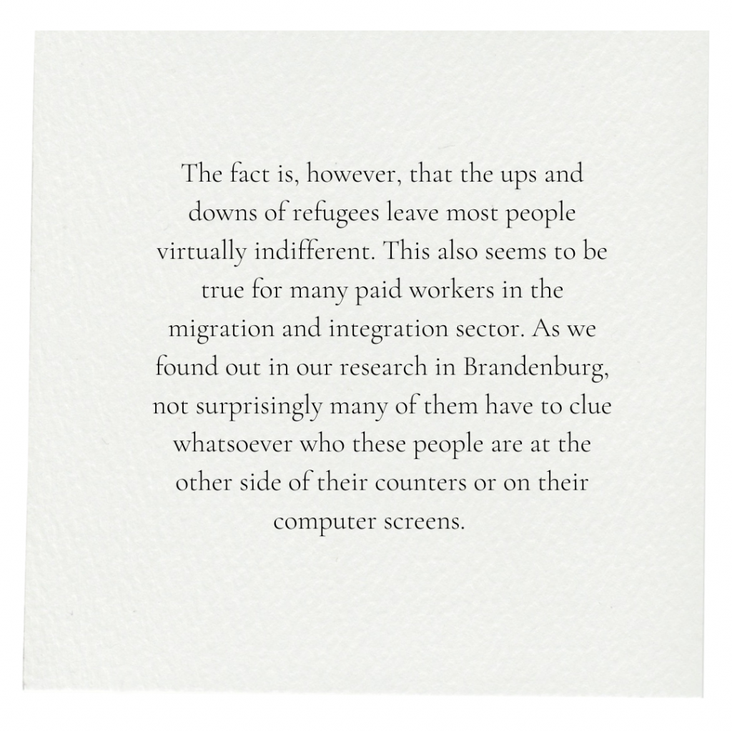 Even ordinary citizens who suddenly run into people in their street, at the bakery and in the supermarket who are patently “not from here” might be motivated to read about the backgrounds of these strangers. Perhaps not out of empathy or genuine interest, but at least out of curiosity. After all, one of the main drives of the human species is this very curiosity. The fact is, however, that the ups and downs of refugees leave most people virtually indifferent. This also seems to be true for many paid workers in the migration and integration sector. As we found out in our research in Brandenburg, not surprisingly many of them have to clue whatsoever who these people are at the other side of their counters or on their computer screens.