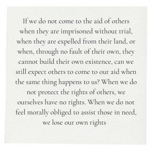 false contradiction. Not only positive but also negative rights lose their meaning through the contract of mutual indifference. After all, the right to non-intervention, to having a private domain in which one can do what is in one’s power, only acquires practical meaning when others come to one’s aid when this right is violated. If we do not come to the aid of others when they are imprisoned without trial, when they are expelled from their land, or when, through no fault of their own, they cannot build their own existence, can we still expect others to come to our aid when the same thing happens to us? When we do not protect the rights of others, we ourselves have no rights. When we do not feel morally obliged to assist those in need, we lose our own rights, argues Geras (1998: 40).