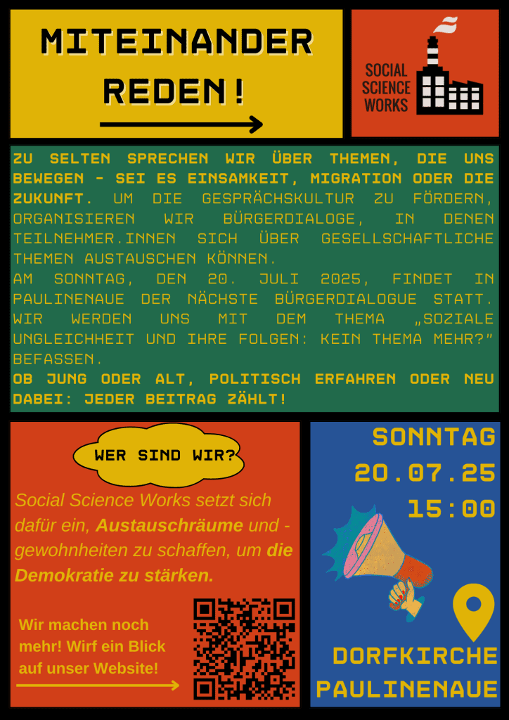 After this statement, as always in Paulinenaue, a lively discussion ensued, in which many perspectives and considerations were exchanged. Coffee and cake were also served. Previously, there had been discussions on topics such as doubt, prejudice, and loneliness. If you would like to participate, our next meeting will take place on July 20 at 3 p.m. sharp in the (multifunctional) village church (Waldstraße 33; 14641 Paulinenaue).
