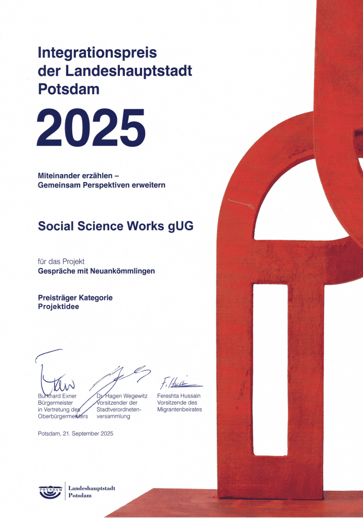 Für das Projekt „Gespräche mit Neuankömmlingen“ wurde SSW am 21. September mit dem Integrationspreis der Landeshauptstadt Potsdam 2025 in der Kategorie „Projektidee“ ausgezeichnet. Das Thema in diesem Jahr lautete „Miteinander erzählen; gemeinsam Perspektiven erweitern“.