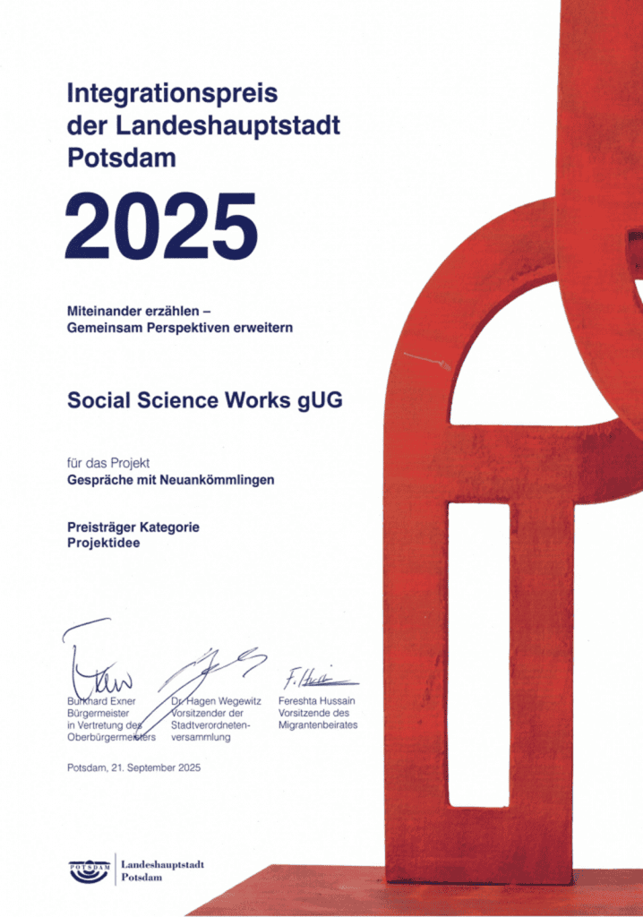 On September 21, SSW was awarded the 2025 Integration Prize of the State Capital Potsdam in the “Project Idea” category for its “Conversations with Newcomers” project. This year’s theme was “Sharing stories; broadening perspectives together.”